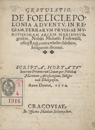 Na ostatniej stronie druku drzeworyt, Orzeł w koronie z liliami Francji w środku [godło Polski za panowania Henryka Walezego].