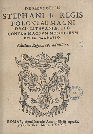 Na stronie tytułowej drzeworyt: orzeł w koronie, w jego sercu herb Stefana Batorego: Zęby.