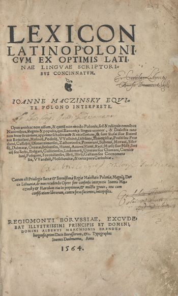 Lexicon Latino Polonicvm, Ex Optimis Latinae Lingvae Scriptoribvs Concinnatvm / Ioanne Maczinsky Eqvite Polono Interprete ; Opus antehac non uisum, & quod non modo Polonis, sed & reliquis omnibus Nationibus Regnis & populis, qui Slauonica lingua utuntur [...] ; Cautum est Priuilegio Sacræ & Serenißimæ Regiæ Maiestatis Poloniæ [...], de non recudendo Opere sine consensu interpretis Ioannis Mączinsky & Hæredum eius in perpetuum [...] interposita. - Regiomonti Borvssiae : Excvdebat Illvstrissimi Principis et Domini, Domini Alberti Marchionis Brandeburgensis, primi Ducis Borussorum, etc. Typographus Ioannes Daubmannus, 1564. - [15],[1]2-515 [właść. 513], [1] karta (karty 1-17,16,19-25,[1],27-94,99, 96-113,112,115-168,166,170-175,179,177-193,19,195-219,202,221-233, 224,235-266,270,268,[1],270-272,263,264,275-296,299,298-304,304, 306-324,327,326-379,680,381-387,386,389,319,391-406,409,408-453, 544,455-459,[1],461-496,[1],498-502,50,504-512,515) sygnowanie #⁶, )(⁴, )(₆, (?)⁴, A-Z⁶, Aa-Zz⁶, AA-ZZ⁶, Aaa-Ooo⁶, Ppp-Qqq⁸ : ilustracje ; 2C.