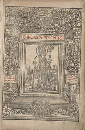 Karta tytułowa drzeworytowa, w środku zwierciadła wskrzeszenie Piotrowina przez św. Stanisława, u góry bordiury przedstawiona bitwa z Tatarami, niżej po prawej i lewej stronie postacie rycerzy z tarczami na postumentach u dołu orzeł jagielloński.