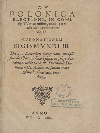 Z Archiwum X. Wdy Ad. J. Czartoryskiego [pieczęć na karcie tytułowej oraz ostatniej stronie].