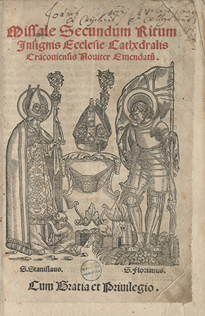 Karta tytułowa czarno-czerwona z drzewor. przedst. św. Stanisława Biskupa i św. Floriana oraz insygniami biskupimi i herbem. Pod drzewor. podpisani święci: S. Stanislaus, S. Florianus oraz sentencja: Cum Gratia et Priuilegio. Na całej k. 186 v drzewor.: Chrystus ukrzyżowany, pod krzyżem stoją: Matka Boża i św. Jan Ewangelista, anioły z trzymają kielichy w dłoniach, do których spływa krew z dłoni i stóp Chrystusa. Cały drzeworyt w ramce z ornamentów roślinnych.