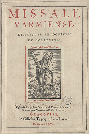 Missale Varmiense / Opera et sumptibus Reverendiss. Domini Martini Cromeri, Varmiensis Episcopi, editum. - Cracoviae : In Officima Typographica Lazari, [po 1 I 1587]. - [33] karty, [1]2-419, [1], 1-86, [3] strony (pierwsza i ostatnia czysta) sygnowanie []¹, #-####⁶, *⁸, A-Z⁶, Aa-Mm⁶, AAa-GGg⁶, HHh⁴ : ilustracje ; 2°.