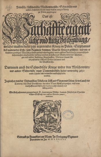 Data dzienna wyd. wg przedmowy dat.: "Datum den letzten Martij. Anno 1585".