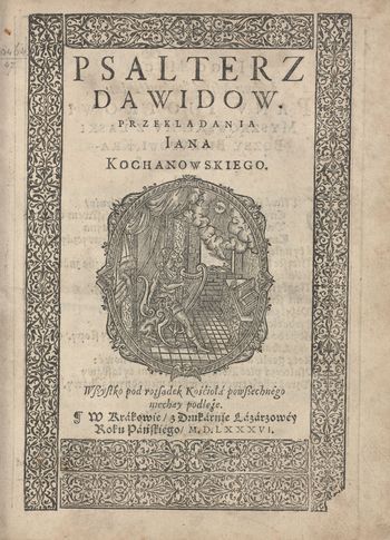Psałterz Dawidów.Przekładania Jana Kochanowskiego / przekładania Jana Kochanowskiego. - W Krakowie : z Drukarnie Łazarzowey, 1587. - 216 stron[pomyłki w paginacji:zamiast strony 45 jest 46,zamiast 142 jest 214],[4]karty, sygnowanie A-Z⁴,Aa-Ee⁴ : ilustracje ; 4°.