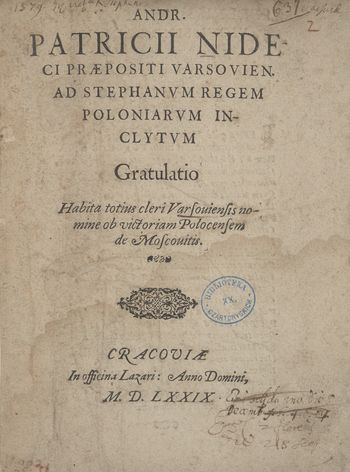 Na karcie A2 tytuł nagł.: Andr. Patricii Nideci [...] Ad Stephanvm Regem Poloniarvm [...] Oratio de victoria Polocensi.