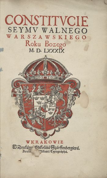 Constitvcie seymv walnego warszawskiego Roku Bozego M.D.LXXXIX. - Wydanie A. - W Krakowie : W Drukarni Mikołaia Scharffenbergiera, [po 18 IV 1589]. - 44 kart (strony [1-3], 4-58, kart [1-3], strony [1], 2-22, kart [1]), sygnowanie A-H⁴, A-C⁴ ; 2°.
