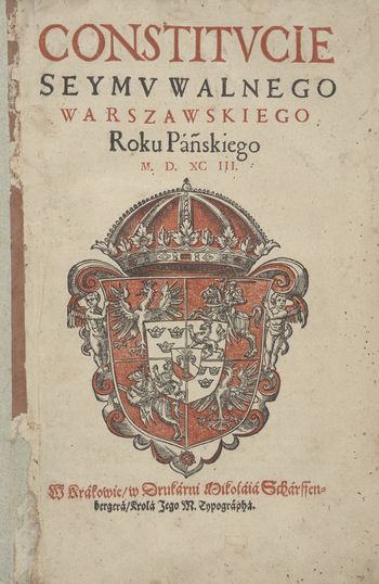 Constitvcie seymv walnego warszawskiego Roku Pańskiego M.D.XCIII. - Wydanie B. - W Krakowie : W Drukarni Mikołaia Scharffenbergera, [po 1593]. - 12 kart, strony [1-3], 4-22, karta [1 czysta], sygnowanie A-C⁴ ; 2°.
