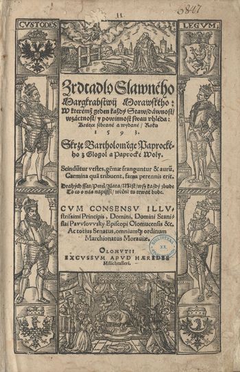 Zrdcadlo Slawneho Margkrabstwij Morawskeh : w kteremż geden każdy Staw, dawnost, wzactnost y powinnost swau vhleda / A w Czesky prelozena skrze Jana Wodičku. - Olomvtii : Excvssvm apvd Haeredes Milichtalleri, 1593. - Wol. ([41] k.,k. I-XXXVII,XXXVII-XXXIX,XXXIX-XLI,[1],XLII-LXXIX,LXXIX-CLXI, [2],CLXII ; [1],CLXII- CLXXXVII,[3],CLXXXVIII-CCLVII,[1],CCLVIII-CCLXIIII,CCLXIIII-CCLXXVIII, CCLXXXI-CCCXXII,CCCXXII-CCCLXXV,[1],CCCLXXVI-CCCCXLVIII), sygnowanie*-*****⁴,#-#####⁴,A-I⁴,K⁶,L-V⁴,W⁵,X-Z⁴,Aa-Qq⁴, Rr⁶,Ss-Vv⁴,Ww-Yy⁴,Zz⁷,Aaa-Sss⁴,Ttt⁵,Vvv-Www⁴,Xxx-Zzz⁴, Aaaa-Iiii⁴,Kkkk⁵,Llll-Vvvv⁴,Wwww⁴,Xxxx⁶,Yyyy-Zzzz⁴, Aaaaa-Paaaa⁴, Q⁶ : il. ; 2⁰.