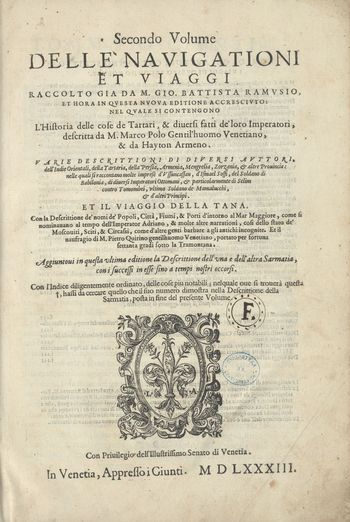 Secondo Volume Delle Navigationi et Viaggi. Vol. 2. l'Historia delle cose de Tartari, & diuersi fatti de'loro Imperatori, descritta da M. Marco Polo Gentil'huomo Venetiano, & da Hayton Armeno. Varie descrittioni di diversi avttori, dell'Indie Orientali, della Tartaria, della Persia, Armenia, Mengrelia, Zorzania, & altre Prouincie: nelle quali si raccontano molte imprese d'Vssuncassan, d'Ismael Soffi, del Soldano di Babilonia, di diuersi Imperatori Ottomani, et particolarmente di Selim contro Tomombei, vltimo Soldano de Mamalucchi, et d'altri Principi. Et il viaggio della Tana. Con la Descrittione de nomi de'Popoli, Citta, Fiumi, et Porti d'intorno al Mar Maggiore, come si nominauano al tempo dell'Imperator Adriano, et molte altri narrationi, cosi dello stato de Moscouiti, Sciti, et Circasi, come d'altre genti barbare a gli antichi incognite. Et il naufragio di M. Pietro Quirino gentilhuomo Venetiano, portato per fortuna fettanta gradi sotto la Tramontana. Aggiuntoui in questa ultima editione la Descrittione dell'una e dell'altra Sarmatia, con i successi in esse sino a tempi nostri occorsi. Con l'Indice diligentemente ordinato, delle cose piu notabili; nelquale oue si trouera questa hassi da cercare quello che il suo numero dimostra nella Descrittione della Sarmatia, posta in fine del presente Volume / Raccolto gia da M. Gio. Battista Ramvsio. - Nuova editione. - In Venetia : Appresso i Giunti, 1583. - 1-[6], 9-18, [10], 1-36, 39-65, 58-185, 187-256 kart, sygnowanie 1-2⁶,3⁴,4⁶,5⁴,A-Z⁸,AA-II⁸ ; 2°.
