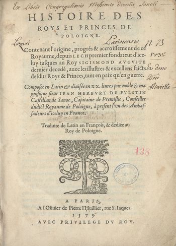 Na karcie tytułowej: "Traduite de Latin en François, et dediée au Roy de Poloigne.".