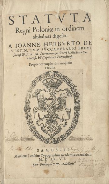 Na stronie tytułowej drzeworytowy herb Polski, w tekście inicjały figuralne.