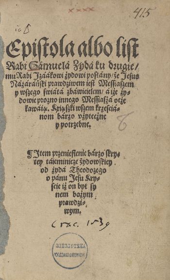 Acc.: Samuel Rabbi Maroccanus Przeniesienie barzo skrytey taiemnice żydowskiey od żyda Theodozego o panu Jesu Kriscie iż on był synem bożm prawdziwym [6] k. sygn.: F₃r-F₈.