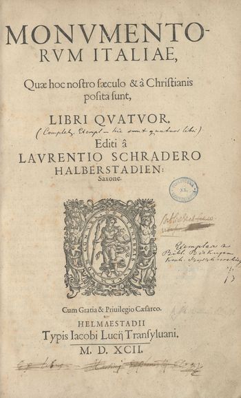 Monvmentorvm Italiæ, Quæ hoc nostro saeculo et a Christianis posuta sunt, Libri Qvatvor / Editi â Lavrentio Schradero Halberstadien: Saxone. - Helmaestadii : Typis Iacobi Luceij Transyluani, 1592. - [8], 1-410, [1] kart, sygnowanie )(⁸, A-P⁶,R⁴,S-Z⁶,Aa-Tt⁶,Vv⁴,Xx-Zz⁶,Aaa-Fff⁶,Ggg⁴,Hhh-Xxx⁶,Yyy⁴ : ilustracje sygnet druk. ; 2°.