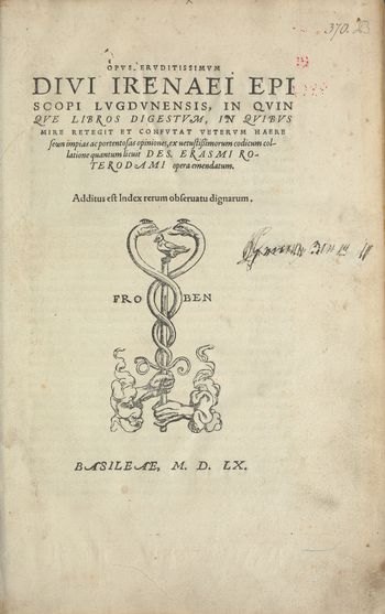 Deska fazowana, skóra brązowa, tłoczenia ślepe, radełko jagiellońskie, tłoczony napis: Opera Irenaei; plakieta ze śladami złocenia przedstawiająca klęczącego króla Dawida z berłem u stóp, tłoczony fragm psalmu 33: Iuxta Est Dominus Eis, Qui Tribulatos Sunt Corde (Pan jest blisko tych, którzy są skruszonego serca); resztki klamer - 16 w.