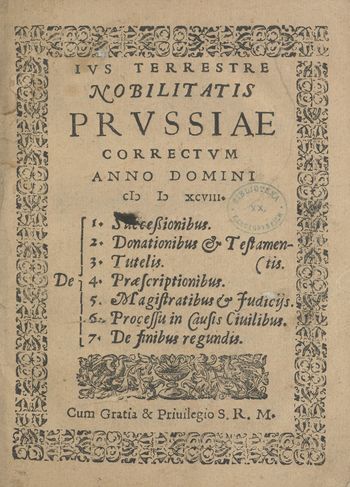 Według Estrichera poprawę prawa z ramienia sejmu pruskiego, uczynili sekretarze królewscy: Reinhold Heidenstein i Mikołaj Niewieszczyński. Na początku tekstu odezwa króla Zygmunta III.
