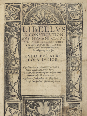 Strona tytułowa w ozdobnej drzeworytowej ramce z herbami Polski, Litwy, Krakowa, Akademii Krakowskiej.