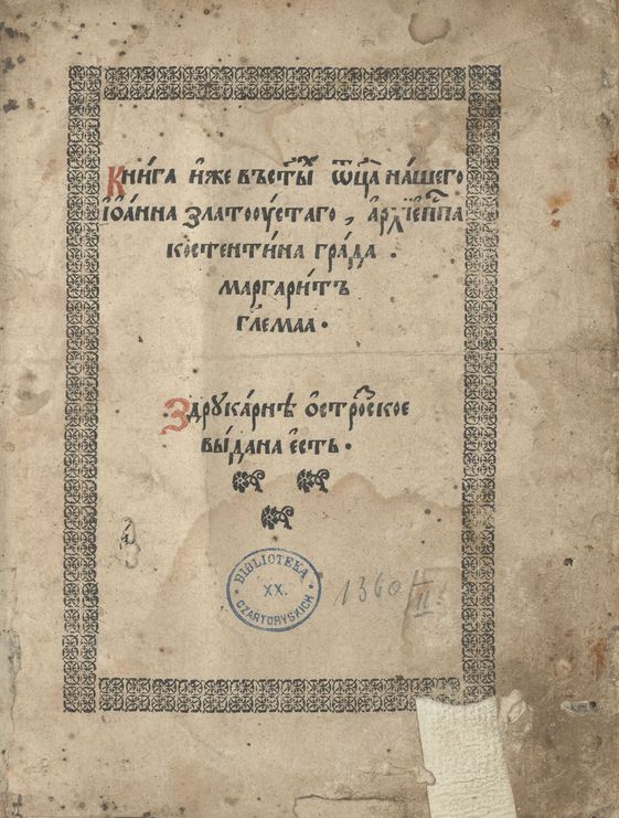 "Xięga ktorey Tytuł Perła Zamykaiąca w Sobie kazań 14 napisanych przez S Jana Złotoustego w oryginale Greckim ktore wytłomaczone na Język Ruski za rozkazaniem JOX Konstantyna Konstantynowicza Ostrogskiego w Drukarni Ostrogskiey są wydrukowane wraz z Biblią Ruską. Ta tedy xięga w R[ok]u 1801 wyjęta z Xiąznicy Opactwa Zydyczyńskiego [...] Ofiarowana iest JW [Cza]ckiemu Staroscie Nowogrodz. dnia 29 Xbris do Jego Zbioru - dawniey ta xięga należała do Xiędza Michała Kurdaszewicza Dziekana [...]" [k. ochronna okł. górnej].