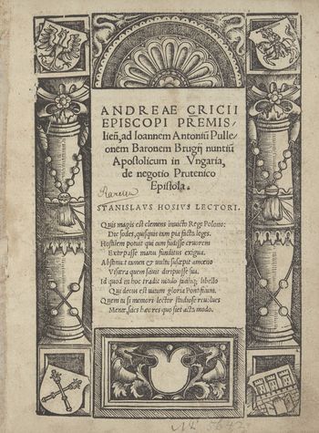 Strona tytułowa w drzeworytowej ramce z herbami: Polski, Litwy, Krakowa i Akademii Krakowskiej.