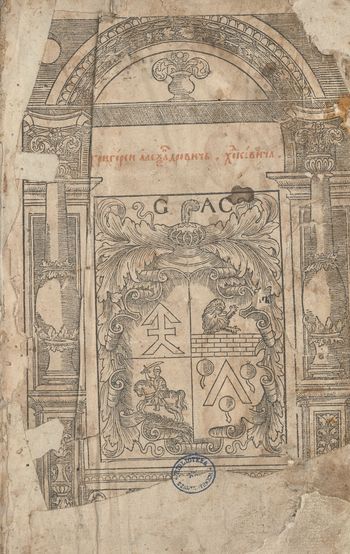 Karta tytułowa architektoniczna, na niej herb złożony Chodkiewiczów oraz litery: GAC [Grigorij (Hrehory) Alexandrowicz Chodkiewicz - według. Estreichera]