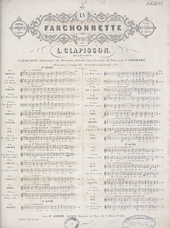 Na stronie tytułowej katalog tematyczny wszystkich fragmentów opery Clapissona opracowanych na 1 lub 2 głosy z akompaniamentem fortepianu z zaznaczeniem nazwisk ówczesnych śpiewaków operowych.