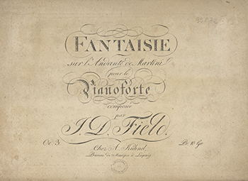 Tektura, papier szary marmurkowy, na okładce naklejka kremowa ozdobnie wycinana, ręcznie zatytułowana: "Muzyka na klawikord... ".