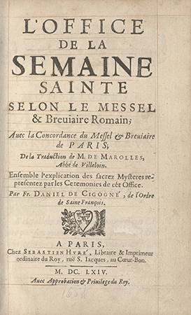 Skóra czerwona, tłoczone złocenia. Delikatny ornament wykonany m.in. tłokami punktowymi na całej powierzchni okładzin. Na okładce górnej inicjały króla "L" z koroną oraz herby Francji i Nawarry, otoczone łańcuchem Orderu Świętego Ducha. Na okładce dolnej inicjały "MT" oraz herby Francji i Hiszpanii zwieńczone koroną. Grzbiet 6 polowy ozdobiony ornamentem roślinnym, liliami, inicjałami "L" pod koroną i wytłoczonym tytułem . Dublura. Brzegi kart złocone "Wystawa Oprawy Książki. Kraków Czerwiec/Lipiec 1925. Właściciel Muzeum XX. Czartoryskich Nr. Katalogu Wystawy 99" [naklejka na wyklejce okładki dolnej].
