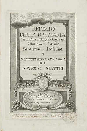 Uffizio della B.V. Maria Secondo la Volgata Edizione : Glossa Latina e dissertazione liturgica di Saverio Mattei. - Siena : presso Pazzini Carli, 1777. - [4] karty, XLVII stron, strony 1-104, [2], 105-186, [2], 187-210, [2], 211-228, [2], 229-268, [2], 269-316, [2], 317-346, sygnowanie []⁴, *⁸, **⁸, ***⁸, []¹, A-F⁸, G¹-4, []¹, G⁵-8, H-L⁸, M¹-5, []¹, M⁶-8, N⁸, O¹, []¹, O²-8, P¹-2, []¹, P³-8, Q¹-4, []¹, Q-8, R¹-6, [], R⁷-8, S-T⁸, V¹-6, []¹, V⁷-8, X⁸, Y⁵ : ilustracje ; 8°.