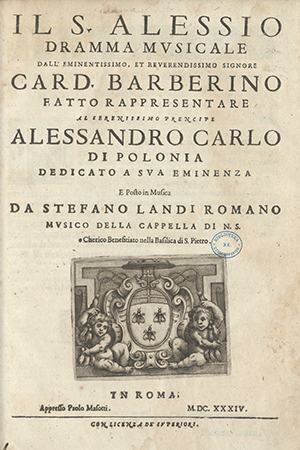 Za nutami 8 rycin przedstawiających sceny operowe: "Prospettive delle Sciene della famosissima Rapresentazione di S. Alessio fatta dall E.mo Sig. Card. barberino nel Palazzo della Cancellaria in Roma. Con licenza de superiori si vendono da Gio Domenico Rossi alla Pace.