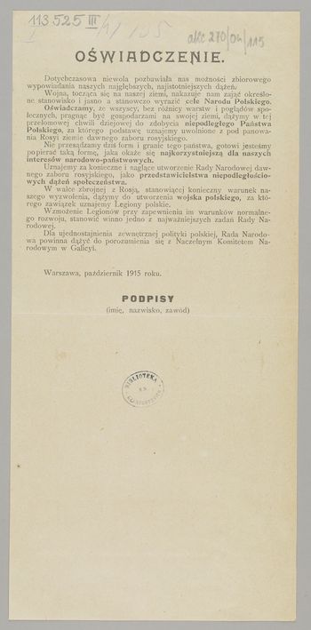 Oświadczenie. - Warszawa : [wydawca nieznany], 1915. - [1] karta (1 strona) ; 31x15 cm.
