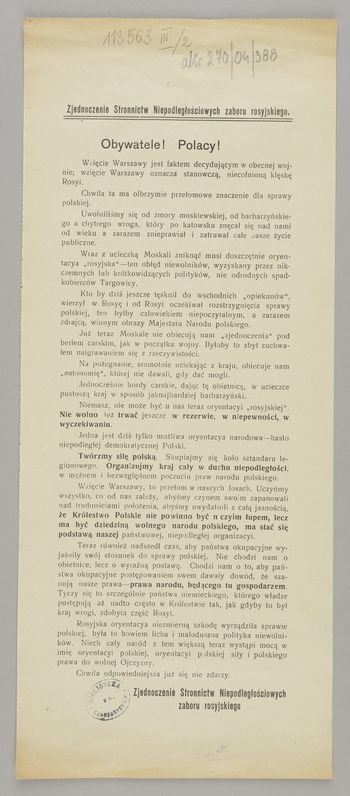 Obywatele! Polacy! / Zjednoczenie Stronnictw Niepodległościowych zaboru rosyjskiego. - [Miejsce nieznane] : [wydawca nieznany], [VII 1915]. - [1] karta (1 strona) ; 36x15 cm.