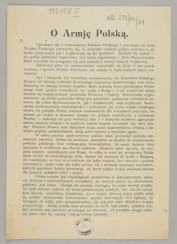 O Armję Polską. - [Polska] : [wydawca nieznany], [po 5 XI 1916]. - [1] karta złożona (4 strony) ; 25x18 cm.
