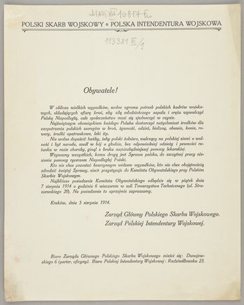Obywatele! / Zarząd Główny Polskiego Skarbu Wojskowego. - [Kraków : wydawca nieznany, 5 VIII 1914]. - [1] karta (1 strona) ; 29x23 cm.