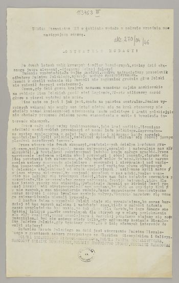 Odezwa patriotyczna wzywajaca do utworzenia niezależnego państwa w granicach zaboru rosyjskiego wraz ze Śląskiem Cieszyńskim i Galicją.