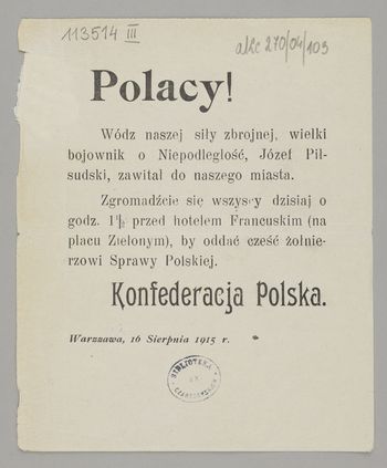 Polacy! / Konfederacja Polska. - Warszawa : [wydawca nieznany], 1915. - [1] karta ; 17x14 cm.