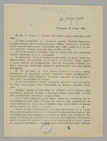 Incipit: W dniu 17 lutego b.r. Komitet Obywatelski przyjął następującą rezolucję ...