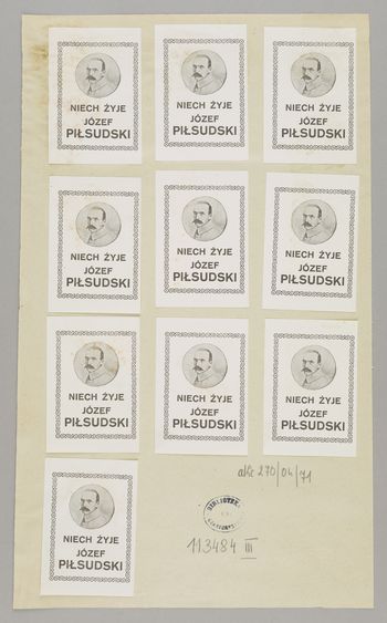 Dziesięć ulotek o wymiarze 7x5 cm naklejonych na kartę; w ramce portret Józefa Piłsudskiego wpisany w koło i tekst.