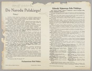 Odezwa zawiera Uchwały Sejmowego Koła Polskiego w sprawie powołania Naczelnego Komitetu Narodowego, w Krakowie w dniu 16 VIII 1914.