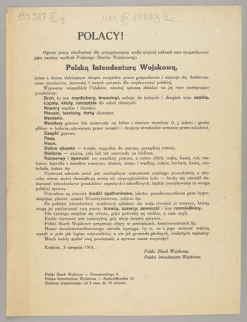 Polacy! / Polski Skarb Wojskowy, Polska Intendentura Wojskowa. - [Kraków : wydawca nieznany, 5 VIII 1914. - [1] karta (1 strona) ; 31x24 cm.