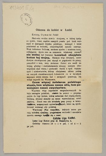 Odezwa wzywająca kobiety do wstępowania w szeregi Ligi Kobiet w celu pomagania tworzącemu się wojsku polskiemu.