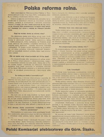 Propagandowy druk z okresu plebiscytu, tekst porównujący reformę rolną ustanowioną oprzez Sejm RP 15 VII 1920 z ustawą niemiecką tzw. Reichssiedelungsgesetz.