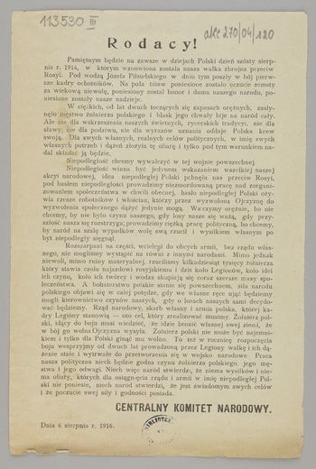 Rodacy! / Centralny Komitet Narodowy. - [Warszawa : wydawca nieznany], 1916 VIII 6. - [1] karta (1 strona) ; 25x17 cm.