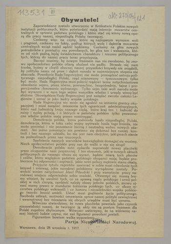 Obywatele! / Partia Niezawisłości Narodowej. - [Warszawa : wydawca nieznany, 28 IX 1917]. - [1] karta (1 strona) ; 25x17 cm.
