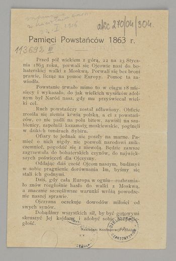 Pamięci Powstańców 1863 r. - [Miejsce nieznane] : Konfederacja Polska, [1916]. - [4] strony (1 karta złożona) ; 17x11 cm.