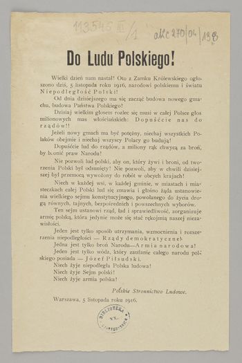 Do Ludu Polskiego! / Polskie Stronnictwo Ludowe. - Warszawa : [wydawca nieznany, po 5 XI 1916]. - [1] karta (1 strona) ; 22x15 cm.