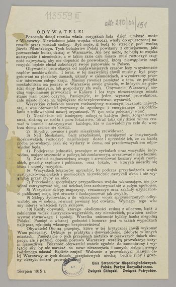 Obywatele! / Unia Stronnictw Niepodległościowych. - [Miejsce nieznane : [wydawca nieznany], VIII 1915. - [1] karta (1 strona) ; 26x16 cm.