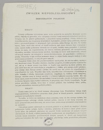 Odezwa zawiadamiająca o powstaniu i celu zawiązania Związku Niepodległościowego Demokratów Polskich poza granicami zaborów.