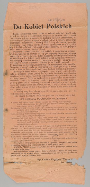 Do kobiet polskich / Liga Kobieca Pogotowia Wojennego. - [Miejsce nieznane] : [wydawca nieznany], [1914]. - [1] karta (1 strona) ; 49x23 cm.