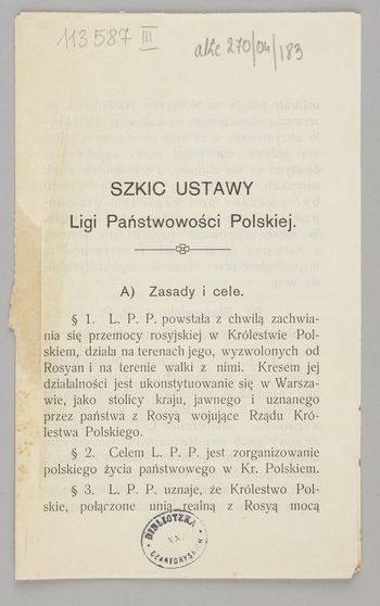 Szkic Ustawy Ligi Państwowości Polskiej. - Polska : [wydawca nieznany], [1915]. - 7, [1] strona ; 18x11 cm.