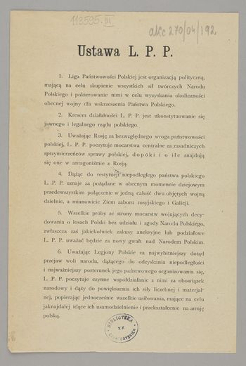 Ustawa L. P. P. - [Miejsce nieznane] : [wydawca nieznany], [1915]. - [1] karta ; 22x15 cm.